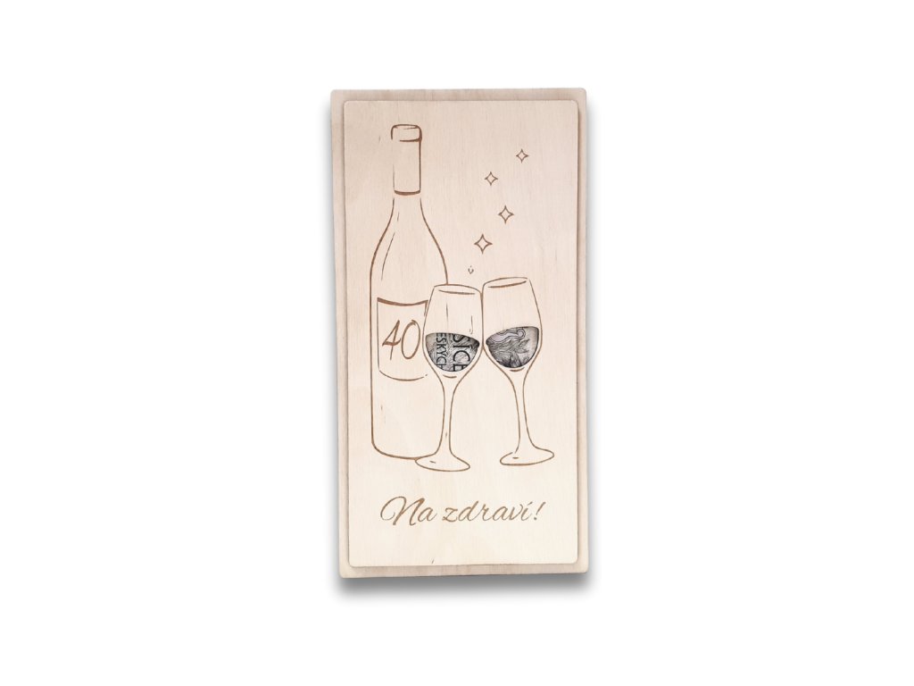 Dřevěná obálka na peníze s jemným gravírovaným motivem dvou sklenek vína a nápisem „Na zdraví!“. Elegantní design dělá z obyčejného darování peněz osobní a stylovou záležitost.