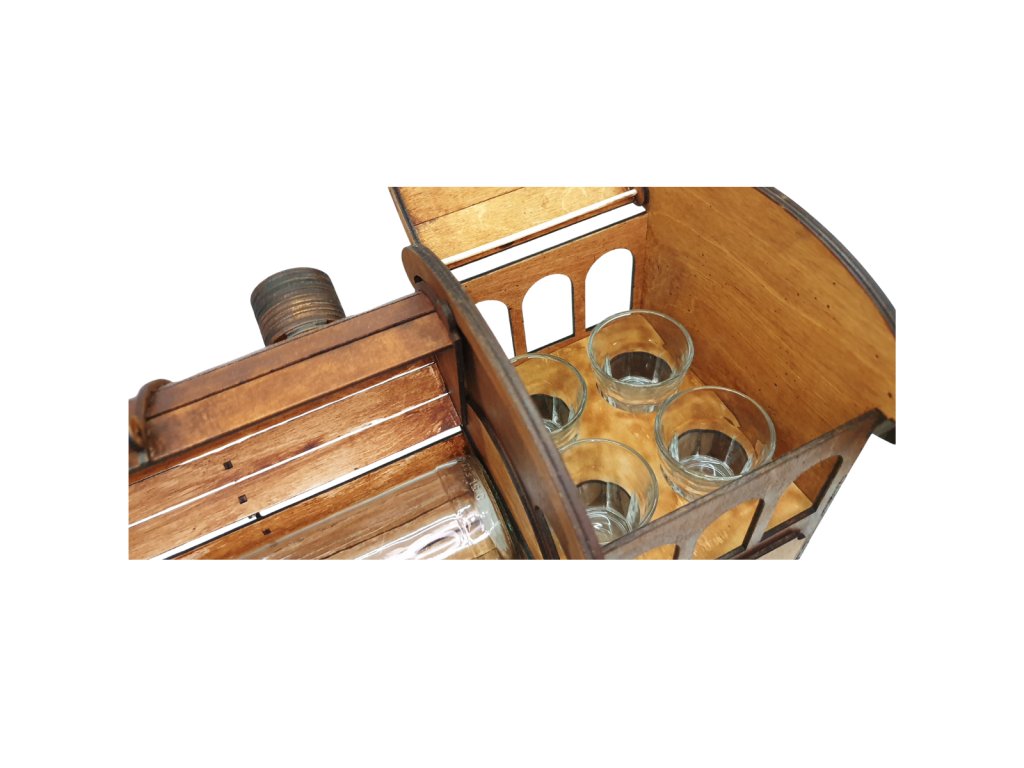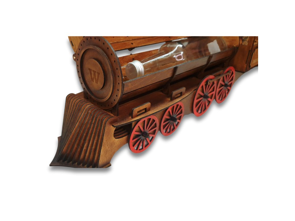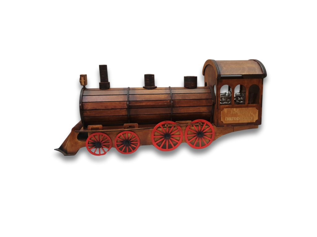 Dřevěná dárková lokomotiva z březové překližky, která slouží jako stylový minibar. Uvnitř se nachází prostor pro jednu láhev a čtyři skleničky, které jsou součástí balení. Celek působí masivně, propracovaně a okamžitě zaujme jako dominantní prvek každé oslavy.