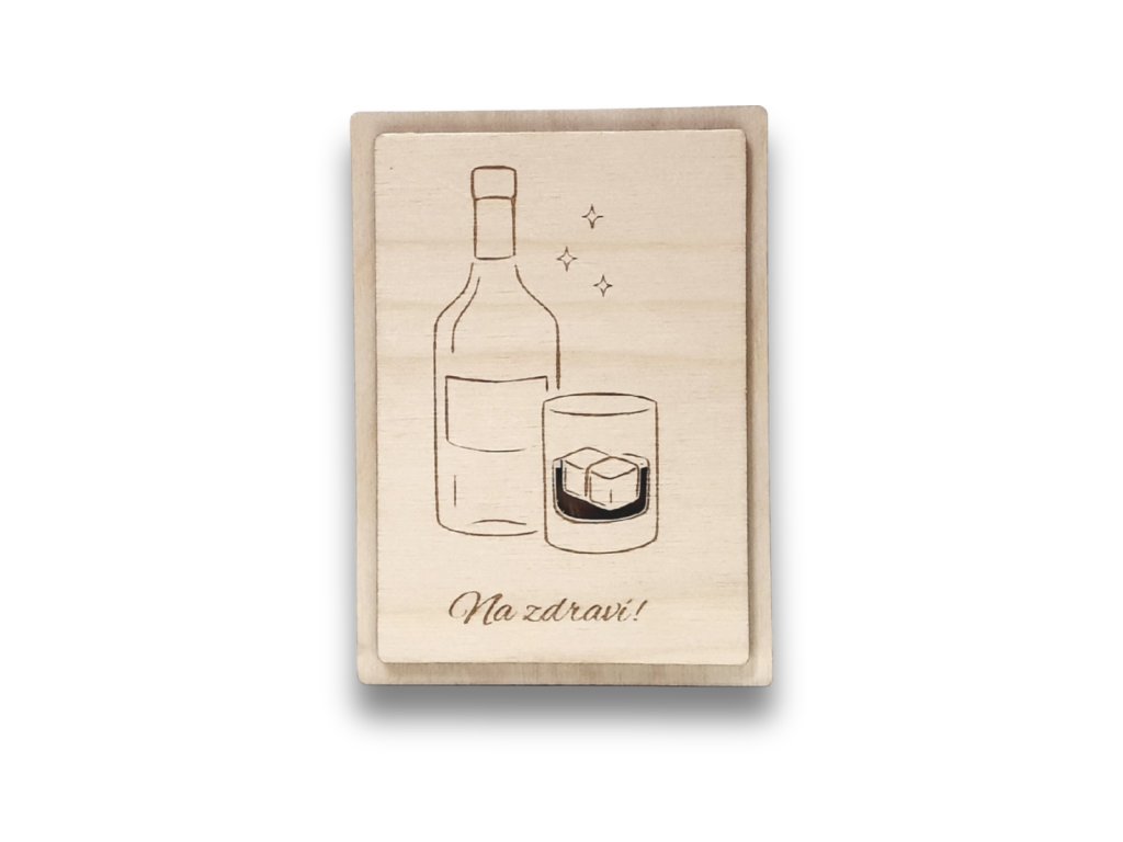 Dřevěná obálka na kartu s jemným laserovým gravírováním motivu láhve a sklenky s ledem, doplněná nápisem „Na zdraví!“. Jednoduchý a elegantní design potěší všechny milovníky dobrého pití a neformálních oslav.