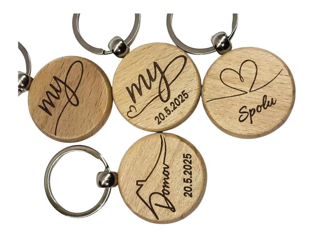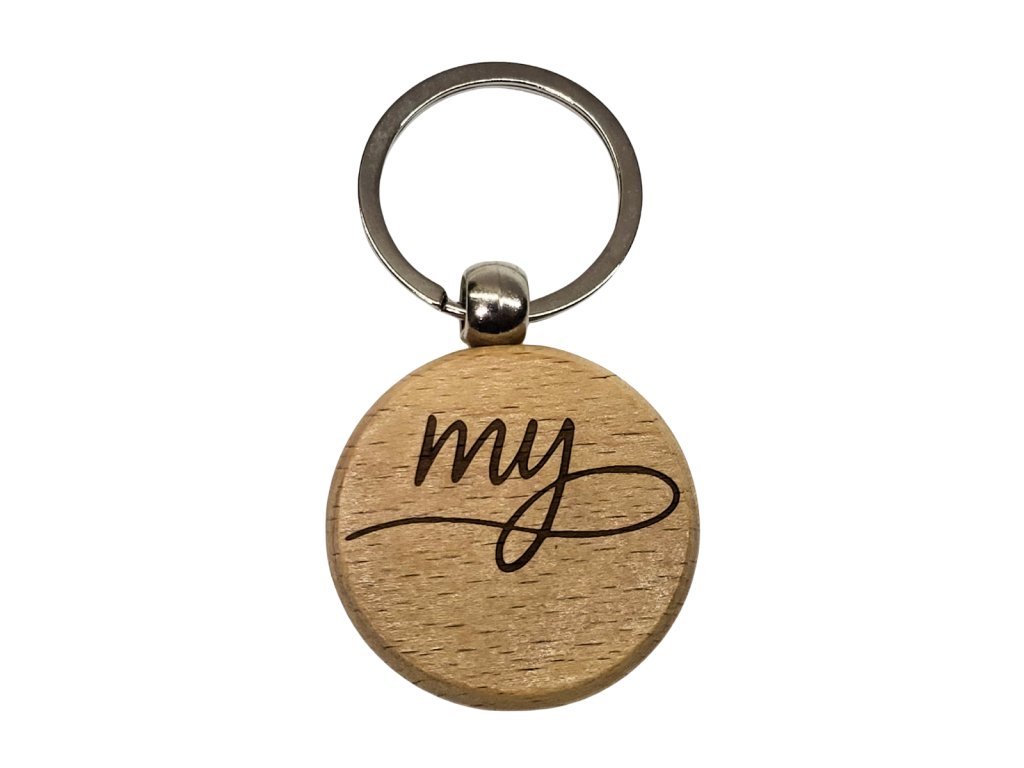 Minimalistická dřevěná klíčenka s gravírovaným motivem „My“.